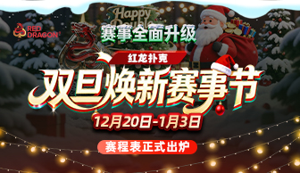 当圣诞的钟声遇见新年的焰火,红龙扑克为你开启年度最盛大的赛事狂欢。 从 12 月 20 日至 1 月 3 日,全平台赛事全面升级,以更高保底、更强福利、更密集赛程,为所有玩家献上一场真正的 年终巅峰盛宴。 双旦焕新赛事节 12月20日 — 1月3日 50,000,000+ 保底奖池 重点赛事推荐 🎅 双旦青龙开幕赛